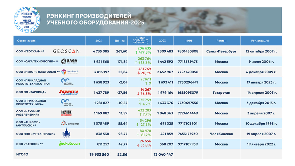 Представленный рэнкинг, отражает результаты работы за 2024 год компаний, которые производят высокотехнологичное оборудование для образовательных учреждений России (код ОКПД22 - 32.99.5 «Производство приборов, аппаратуры и моделей, предназначенных для демонстрационных целей»). Он показывает значительный рост производства и смену лидеров по сравнению с 2023 годом.